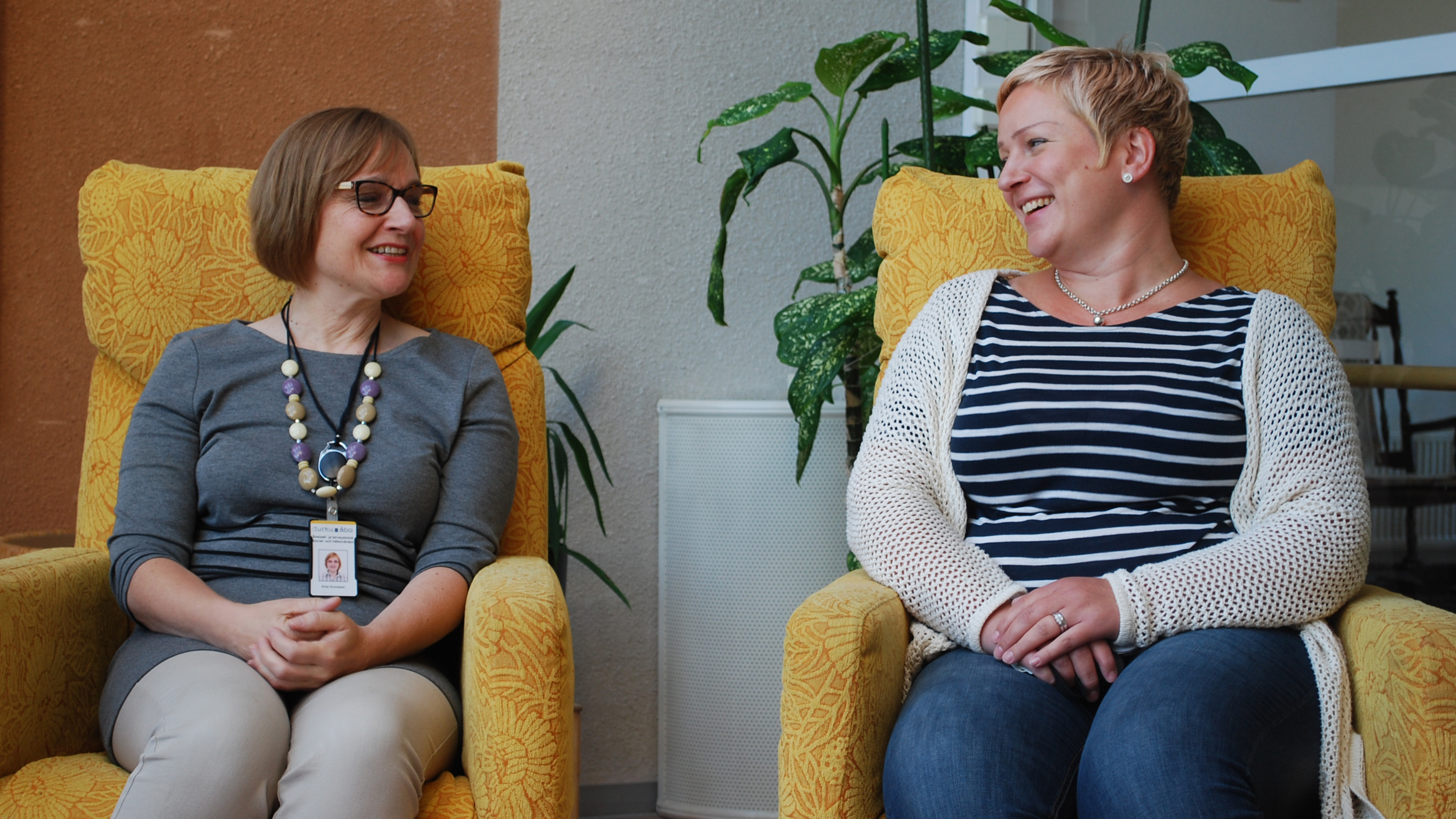 | Varsinais-Suomen I&O -muutosagentti Kirsi Kiviniemi (vas.) ja hankejohtaja Johanna Ritvanen haluavat koko maakuntaan yhdenmukaisen toimintamallin ikäihmisten palveluohjaukseen ja -neuvontaan. Kuva: Elina Salmi |